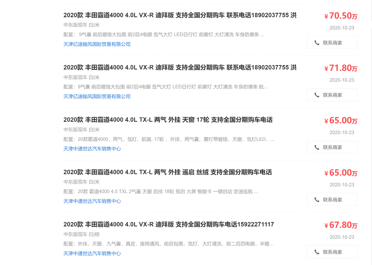 目前2020款霸道2700的价格在40万~50万之间,要注意,远低于这个价格的报价信息就不要相信了,极有可能是“线下强买强卖”的诈骗陷阱。