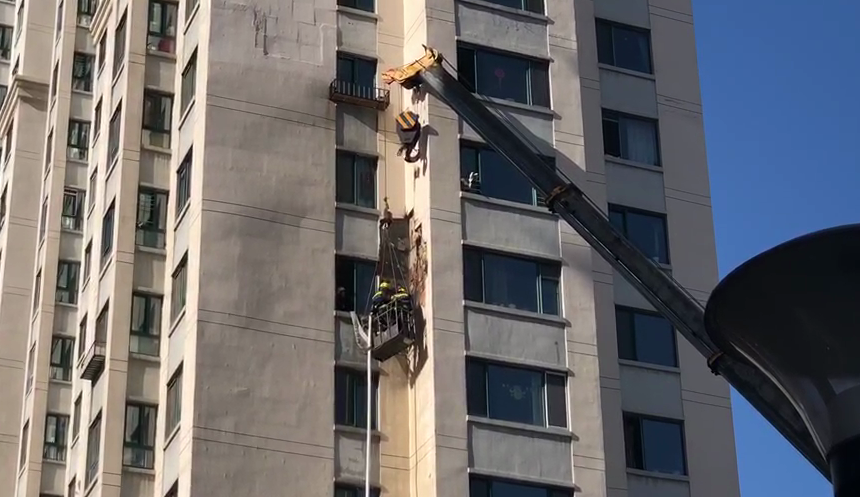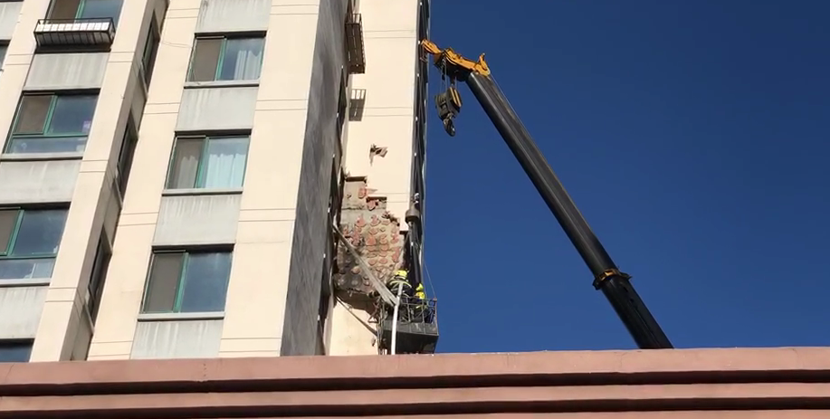 现场,消防部门对单元七楼上下的位置进行外墙破拆。初步判断,可能是墙体内保温苯板出现了内燃的情况。