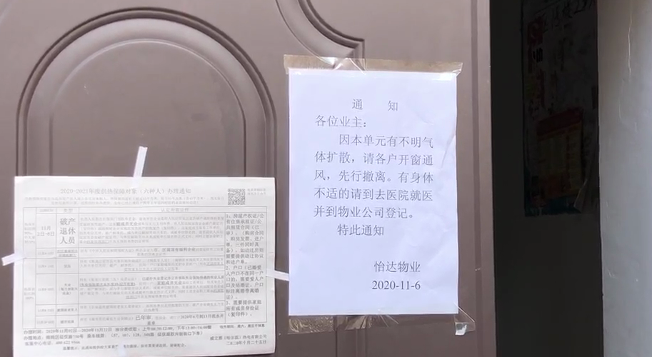 物业在单元门上也贴出了通知。通知内容:因本单元有不明气体扩散,请各户开窗通风,先行撤离,有身体不适请到医院就医,并到物业公司登记。