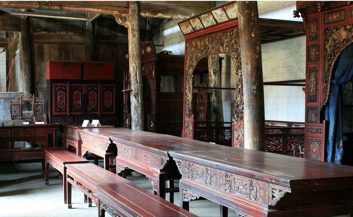 其建筑白墙上有各种保存完好的古诗古画,房梁上、木柱上雕刻着各种栩栩如生、活灵活现的木雕。