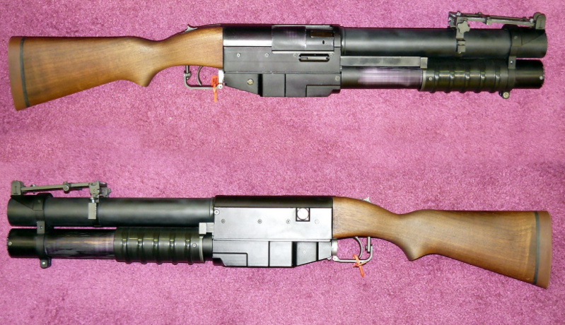 开发很快,到1968年海军军械中心就拿出了原型。一种采用类似泵动霰弹枪原理的连发榴弹发射器,管式弹仓内可以装填三发40x46mm榴弹,加上弹膛中一枚最高携弹量4发。考虑到海豹的负重问题,这批榴弹发射器还采用了大量铝制部件来减重。