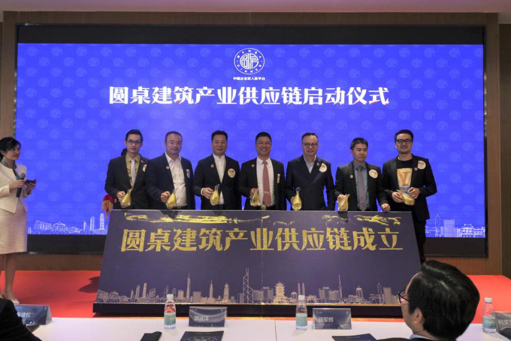 在现场100多位企业家的见证下,参与启动会仪式的领导嘉宾们将手中的金沙倒落,刻画这重要而又有仪式感的美好瞬间 --《圆桌建筑产业供应链》正式成立。