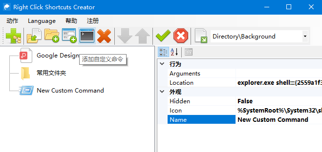 添加命令的自定义程度很高,右侧可以更改命令的名称、图标、位置和行为,所以往里面添加一些 Windows 快捷方式、程序什么的都可以。