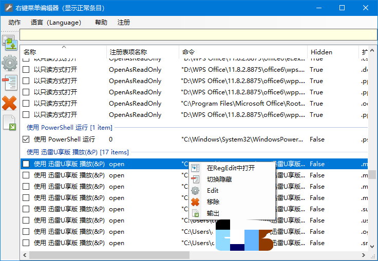 这个功能用来编辑其他程序添加的右键命令 ,比如从上面大家可以看到来自程序 WPS、Power Shell、迅雷 U 享版的右键命令。