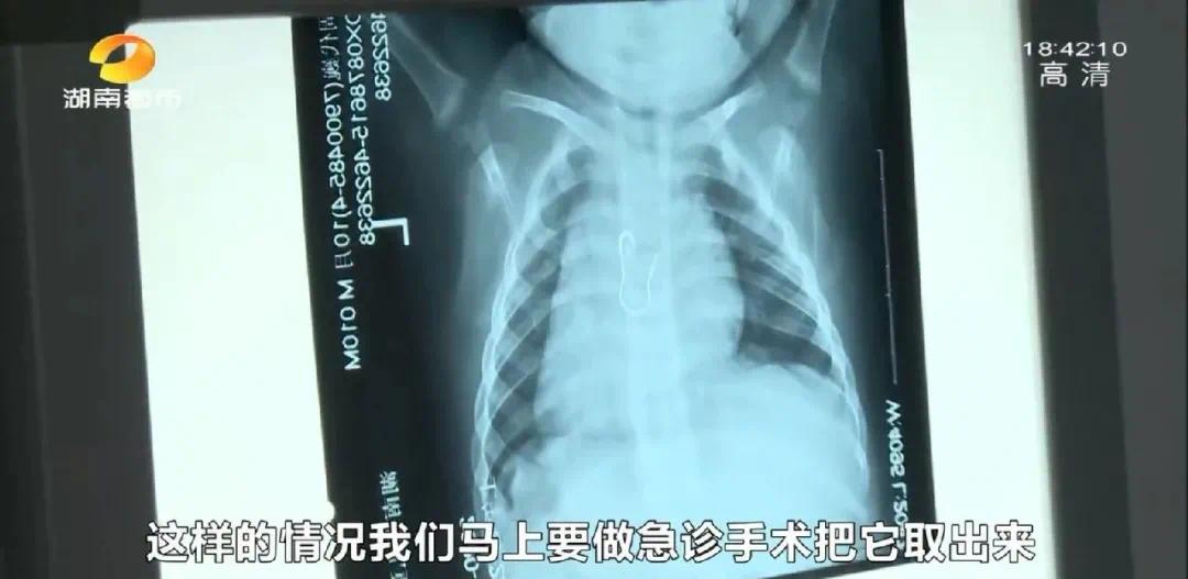 从前晚9点多萌萌误吞曲别针,到昨天早上8点多抵达湖南省儿童医院,萌萌度过了牵动人心的12小时。抵达医院后,医生立即为萌萌进行检查,通过CT检测发现,食道中的曲别针清晰可见,医生立即为萌萌准备手术。