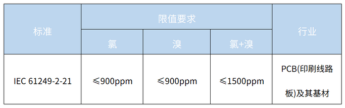 近年来,以欧盟为首的国际绿色环保指令及众多法规公约限制卤化物的生产和使用。目前,业内对于卤素的管控要求只针对氯元素及其化合物,溴元素及其化合物,特殊客户要求除外。对于许多来源不同的卤素,大多数机构采用国际电工委员会(IEC)制定的IEC 61249-2-21:2003标准。