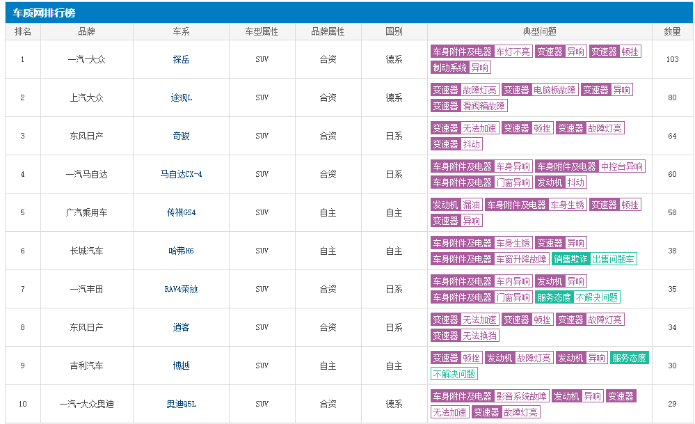 定位于中型SUV的大众探岳,终端裸车起售价仅16万起(成都车市),再加上较大的空间表现让其成为了不少消费者所喜欢的车型。而在十月SUV投诉榜单上,探岳以103条的投诉量成功坐稳第一名,其主要问题在变速箱顿挫、异响,制动系统异响,车灯不亮等问题,从上也可以看出大众的双离合问题还不小。而出现变速箱问题的还有大众途观L这款车,高达80条的投诉量,让其也成为仅次于探岳的问题车型。