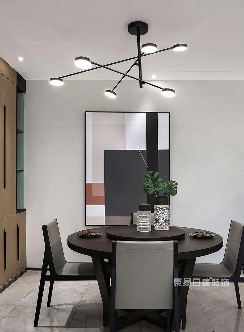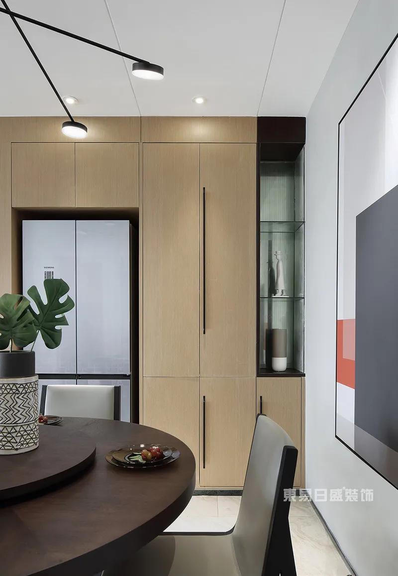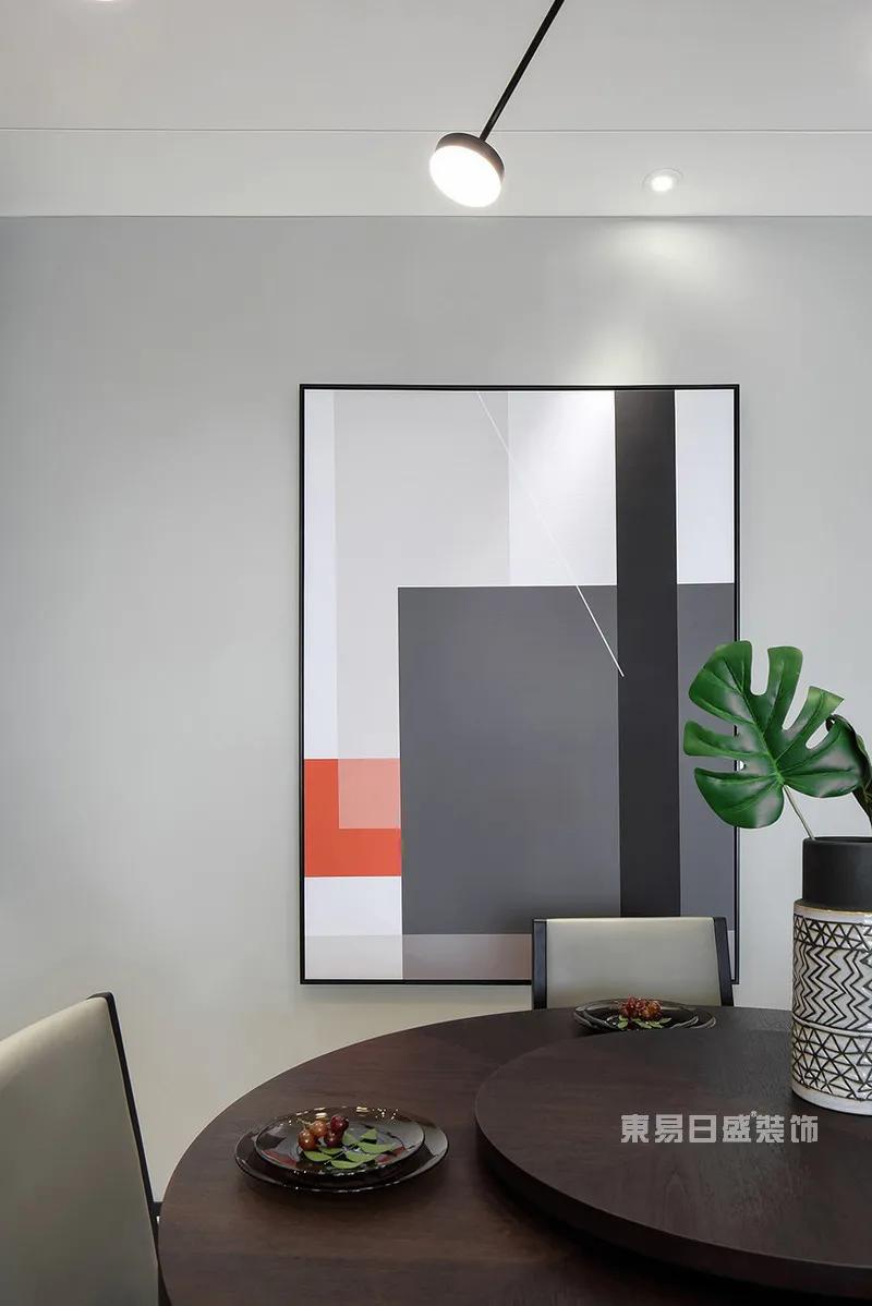 餐厅以白色和原木色为主,深咖色的实木餐桌、餐椅,冷静的几何色彩抽象画,收纳柜半开放式的一隅,一切都极尽简约与实用性。