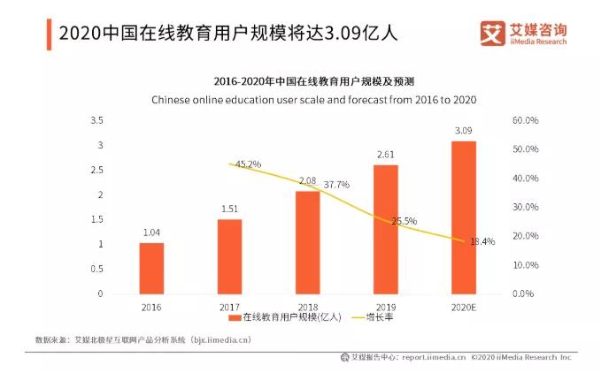 在艾媒咨询发布的《2019-2020年中国在线教育行业发展研究报告》中指出,中国在线教育市场规模和用户规模正持续扩大,预计2020中国在线教育市场规模有望增至4538亿元,用户规模将增至3.09亿人。