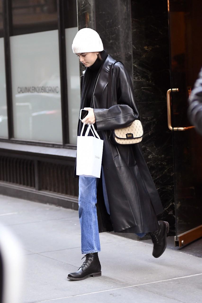 克劳馥的女儿kaia不仅继承了妈妈的大长腿,也继承了妈妈的好衣品,长款皮衣加牛仔,用一顶小白帽子点睛,非常时髦。