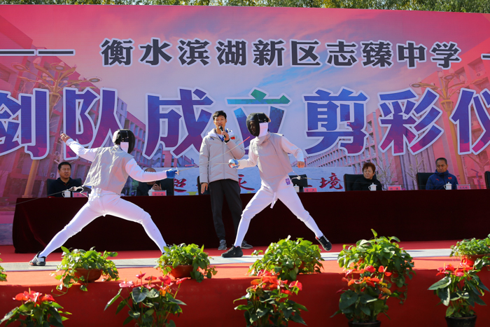 11月8日上午,衡水滨湖新区志臻中学击剑队成立剪彩仪式在操场隆重举行。为响应国家号召,深化体教融合,促进青少年健康发展,我校在市领导的关怀指导下,多方联系,积极筹措,在今天成立了衡水滨湖新区志臻中学击剑队。