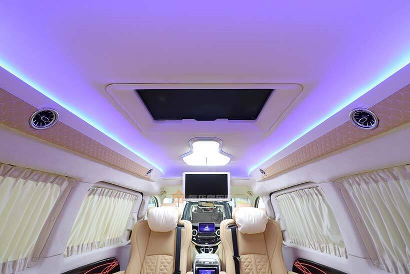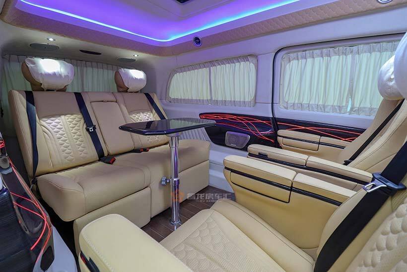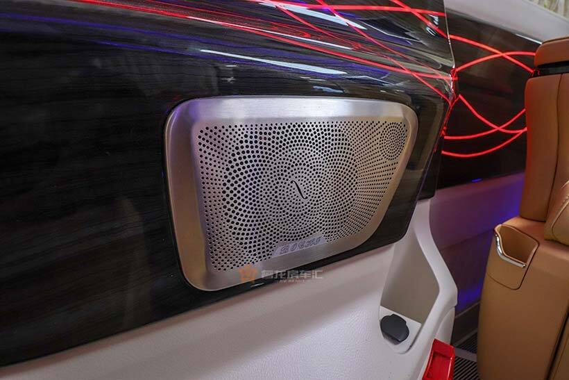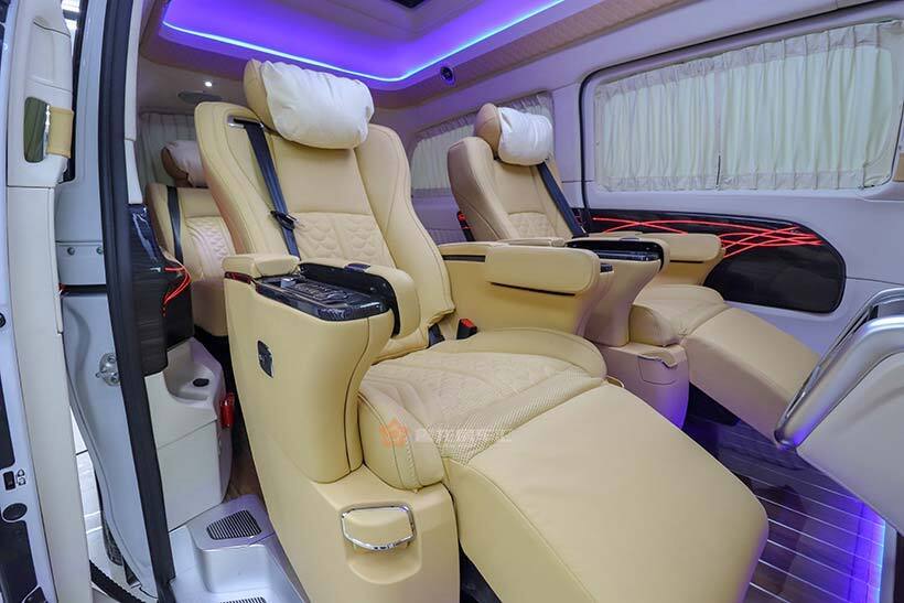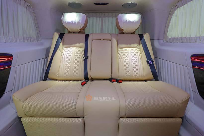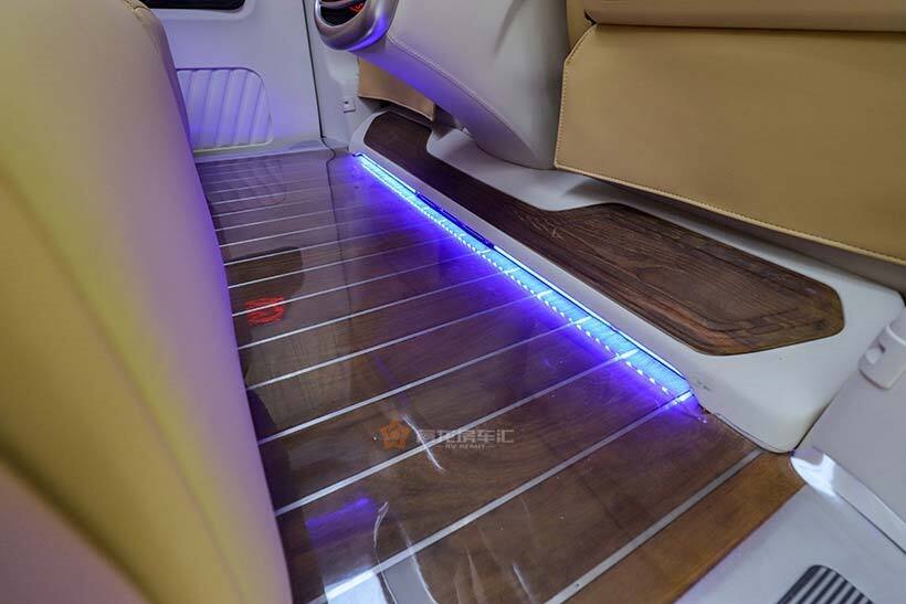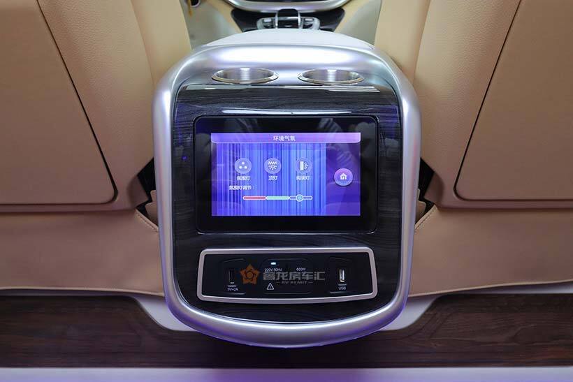 高光兰黑檀木拼真皮方向盘,一体式多功能扶手箱,高清仪表,中控屏,镀铬旋涡前舱空调出风口,主副驾驶座椅可前后滑动调整,背部隐藏升降小桌板,下后方则是后舱前排的独立脚踏,木纹点缀,氛围灯光烘托,实用性和观赏性在新款改装车型中更加注重细节。