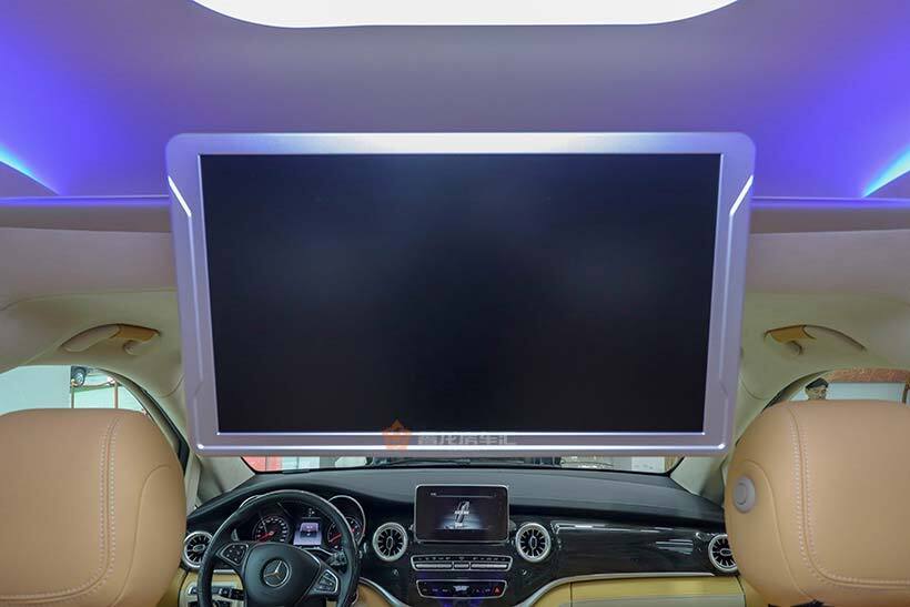 内饰方面,IDG定制版奔驰v260L商务车高光檀木地板(四季环保透明地膜)高级麂皮绒+皮革包覆车壁,内置电动窗帘,车顶龙鳞纹皮革装饰,豪华LED灯+可调节变色氛围灯光,中下车壁内置可变流水氛围灯。内舱设备有:22寸安卓智能电视,柏林之声立体环绕音响系统,车载冰箱,电动全景天窗,区域智能空调等,配置非常丰富。