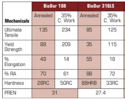 根据Carpenter 的数据,BioDur 108不锈钢的镍含量最高为0.05 wt%。此外,BioDur 108还具有比BioDur 316LS 材料更好的机械性能。