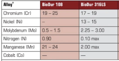 ▲表1. BioDur 108,BioDur 316LS的典型化学成分,BioDur 108基本上不含镍,是对患者友好的传统使用材料的替代品。