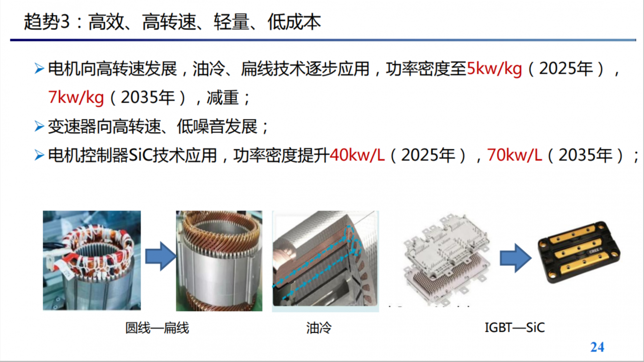 3、电驱动总成向高效率、高集成、高品质、轻量化、平台化、低成本 等方向发展。
