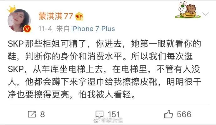 去逛SKP(一家奢侈品购物中心)时,怕柜姐看不起自己,老公要蹲下用湿巾帮她擦完鞋才能进去。