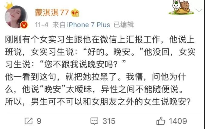因为女实习生晚上汇报完工作对老公说了晚安,老公转头就把她拉黑了。