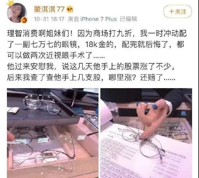 戴7w7的眼镜,自己觉得贵老公却来安慰她,即使股票跌了也要满足她。