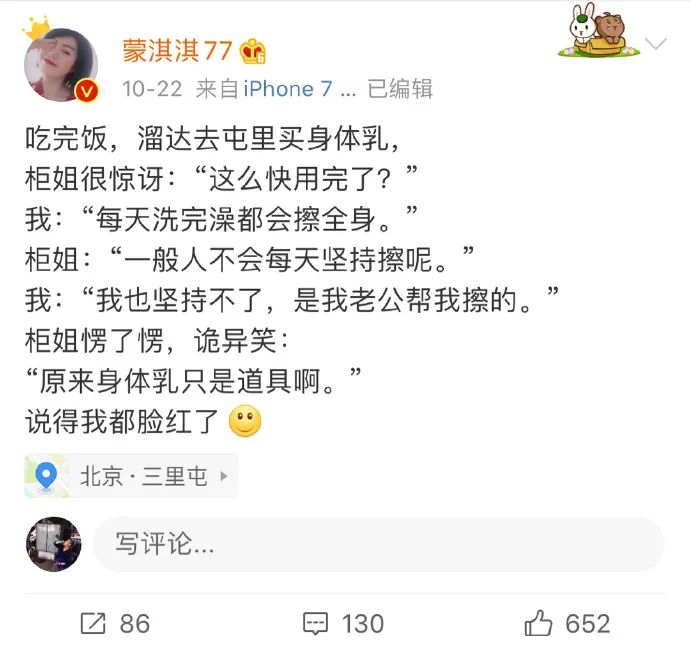 这个博主把自己定位为一名生活在北京的中产阶级,有一个帅气多金还极度宠她的老公。