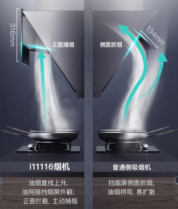 极致的吸排效果,离不开在拢烟、吸烟、排烟三方面的优化升级。针对侧吸式油烟机的设计通病——拢烟性能差,华帝品牌通过创新研发,博采顶吸式的直排方式融合至华帝天穹油烟机i11116中,可见,华帝天穹油烟机i11116的拢烟效果绝对是业内首屈一指的。