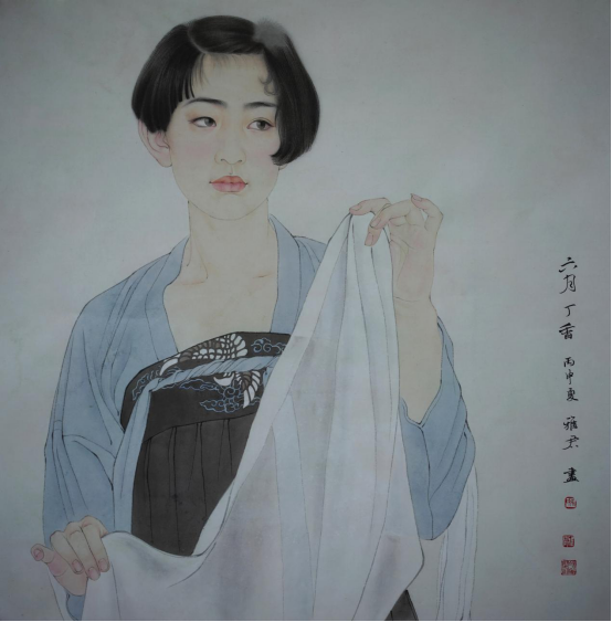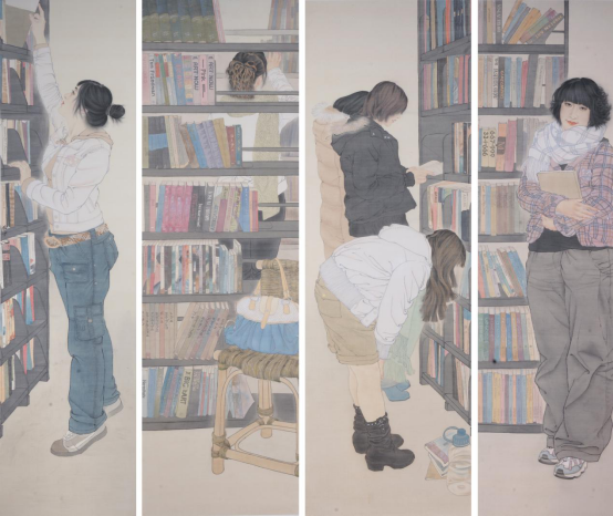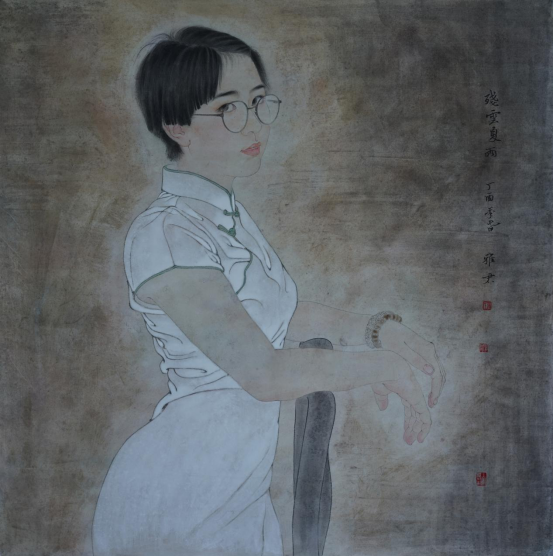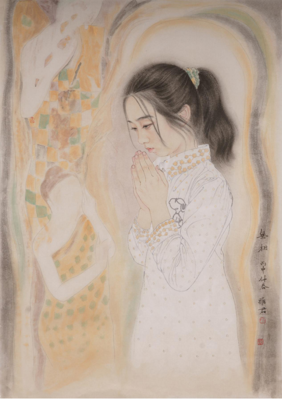 张雅君入选第十二届全国美展进京展的工笔画代表作《知》,将当代大学生求知进取、精进不息的时代主流用心捕捉,以传统的笔墨表达现代的服饰,彰显地是传统工笔语言与现代服饰矛盾体的艺术统合;以纯粹的工笔语言与国学丰富而深刻的文化内涵相合,画面承载的是中国人求知精进、含蓄内敛、发展传承的和谐圆融精神。这是一幅捕捉时代昂扬健朗主流精神的精品力作!在画面架构中,融入了诸多西方现代构成的语素,使传统工笔画语言注入了新的内涵;以四条屏形式贯穿于其中,体现的是现代开放包容的时代思维理念,也是工笔画形式语言的新突破!她的时代篇之《生活》一画,更是以质朴的老人形象表达了一种“与我之境,人惟于静中得之”的恬淡的朴实的生活态度,是当下百姓生活的朴素缩影。采用特殊材质和粗犷的肌理语言诉说当下时代百姓生活的真挚感受。采用超大画面的制作,以一种与前者不同的语素方式,诉说了百姓新时代生活的新语境。如果说《知》是以反映当代青年大学生求知精进为主流的话,那么时代之《生活》则是百姓恬淡平铺生活的艺术再现。由此可见,张雅君对于生活的关注,对于生活的热爱,以及对于当下时代人文精神的关怀。一方面,看出她对于时代创作主题的宽泛适应,另一方面也看出她多方面拓展创作领域的企图和追求,而由此可见其明显超越同龄人的创作实力和生活体悟。与前两者不同,《硕果》、《看取莲花净,应知不染心》、《如来》等则是表现出她对人生和生活无尽禅意的领悟及不沾染一尘世俗的内心,体现地是其对于人生境界的锤炼和溯求。