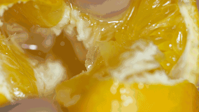 拿起一小瓣融化在口中,梦幻又迷离,像泡泡一样皮薄易破,轻咬果汁四溢,像拿针戳破了装满水的气球,果汁涌进嘴巴里~