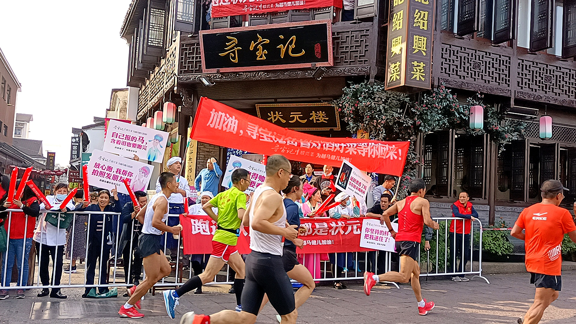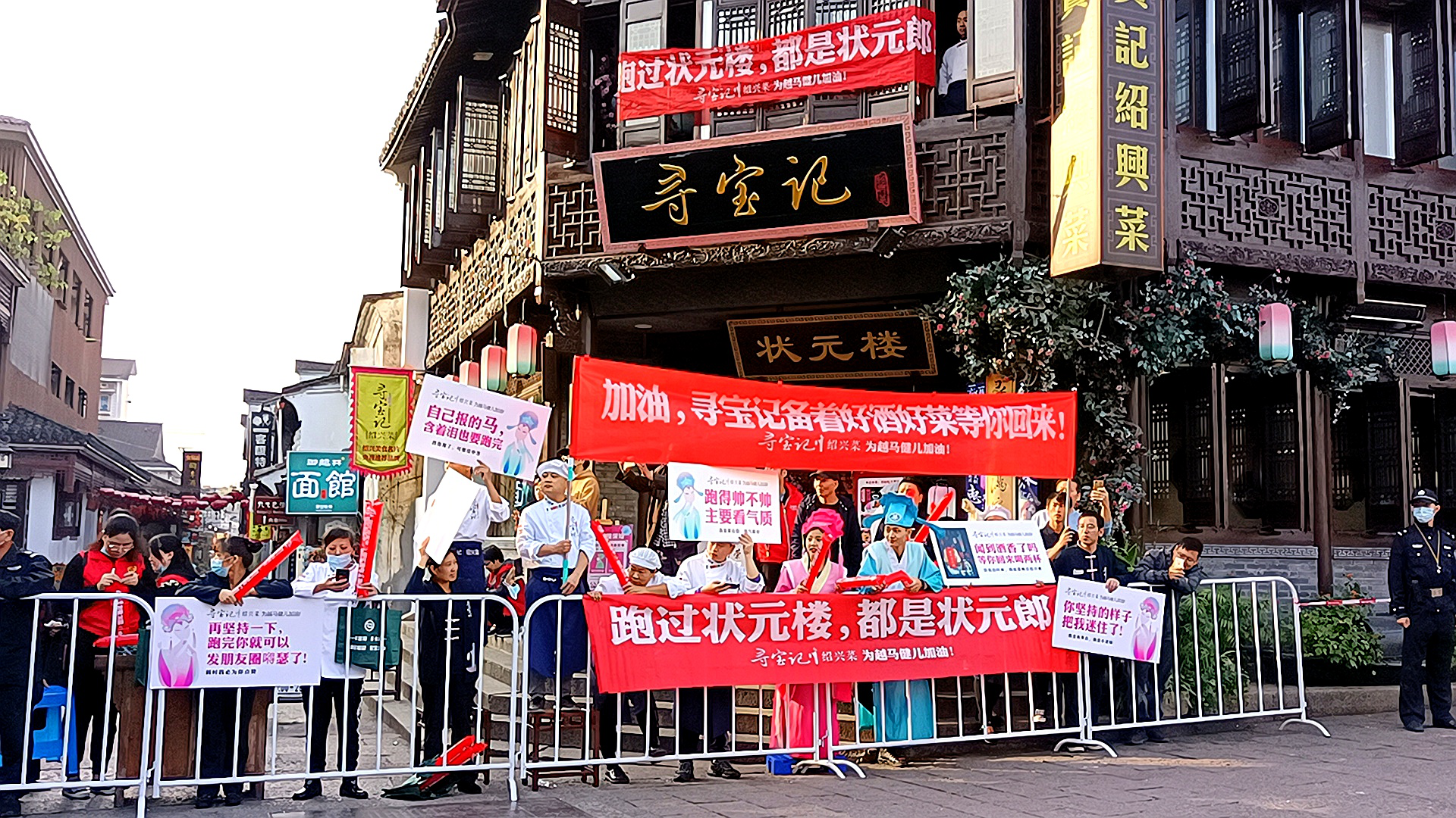 11月8日,2020绍兴马拉松赛在奥体中心鸣枪开赛,来自全国各地2万多名马拉松选手跑上“全国最美赛道”,在仓桥直街的寻宝记绍兴菜门口,有数名高举着标牌的“古装人”和厨师们组成的啦啦队,为马拉松健儿们加油呐喊,标牌上的标语诙谐有趣,引得路人纷纷拍照。