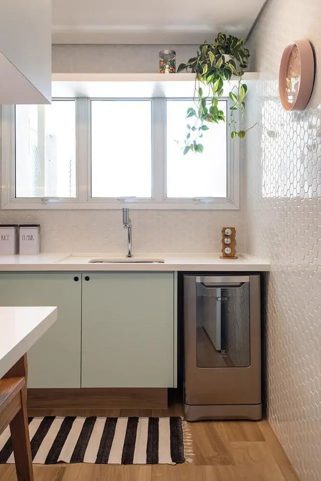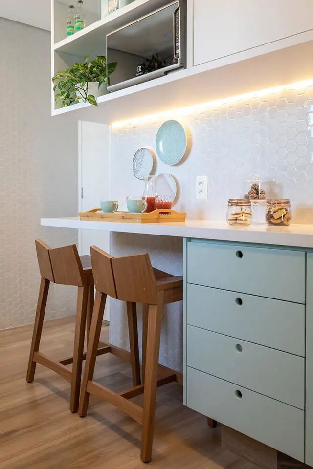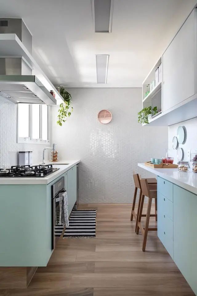 虽然他们家厨房是双一字型的,但并并没有依照常规操作,不锈钢水槽和燃气灶放到了同一侧。另一边柜子尾端空出,专门规划成小吧台,周围的地柜还设置成了无把手的抽屉,不得不承认,细节考虑到的十分到位!