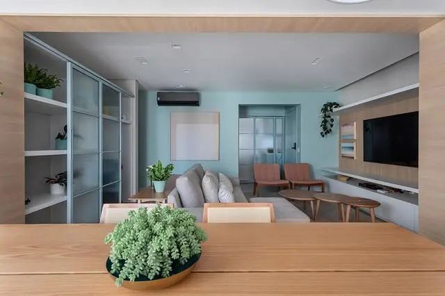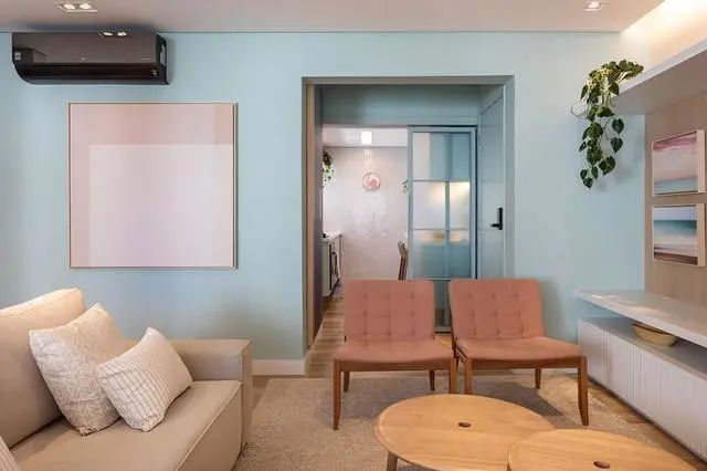 归功于生活阳台,客厅光照通风当然没得说,你看一下这没开灯都够亮堂。家中要想舒适更多人挑选将原木色+白色,但他们家就不太一样是原木色+浅蓝色,反而更多了一些的清爽。