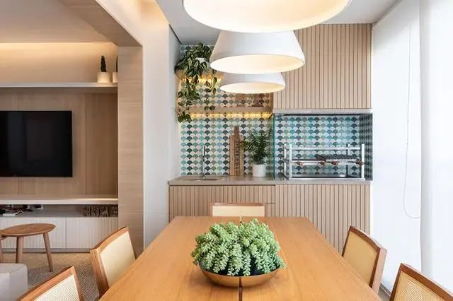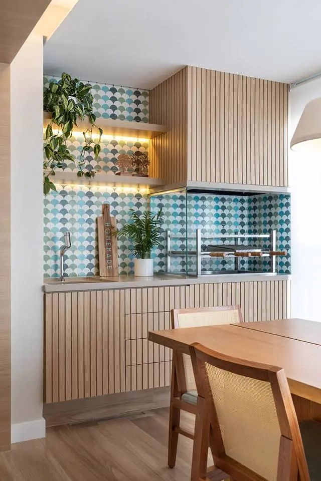 专门在一侧装了烧烤架,连着周围的小不锈钢水槽做了组合柜,餐边柜也省了。内部贴上瓷砖省得清理不便,对于油烟难题,顶部木格栅包着的便是抽油烟机,想要做的更为彻底,最好是将连着客厅的门洞装上折叠门,省室内空间不多占地。