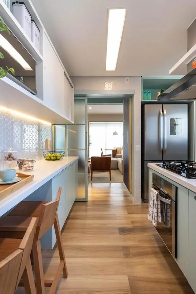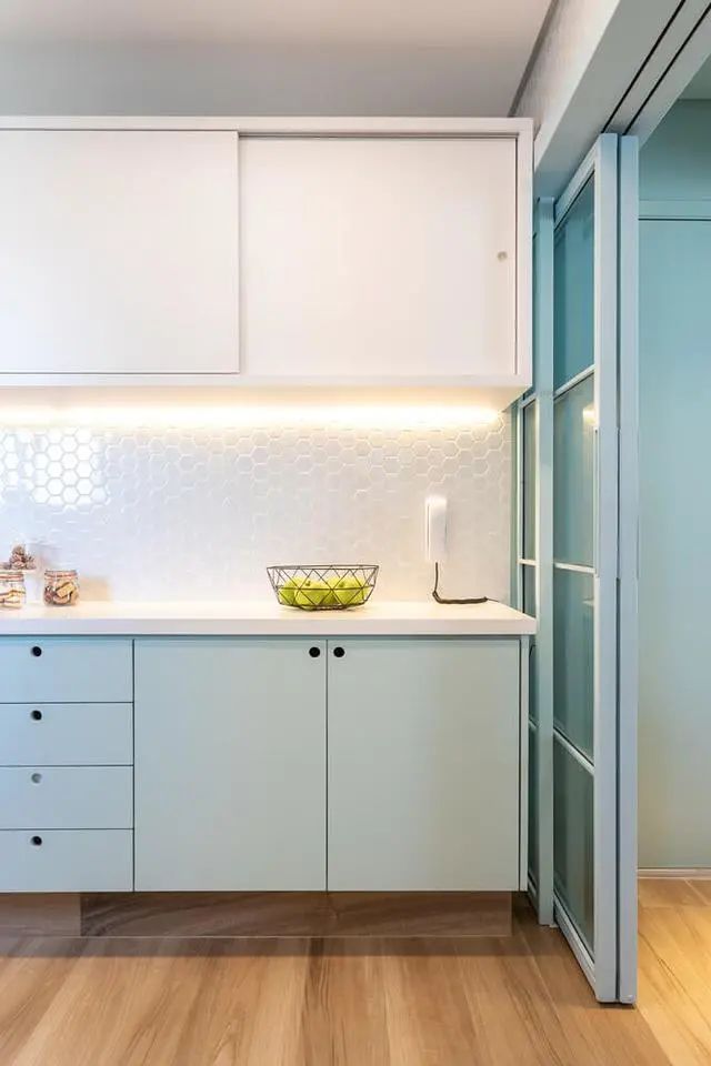 厨房吊柜也是别有用心的采用了平开门,只不过本人建议最好是可以做到顶,底部的灯带可以说也是十分体贴了,晚间辅助照明。