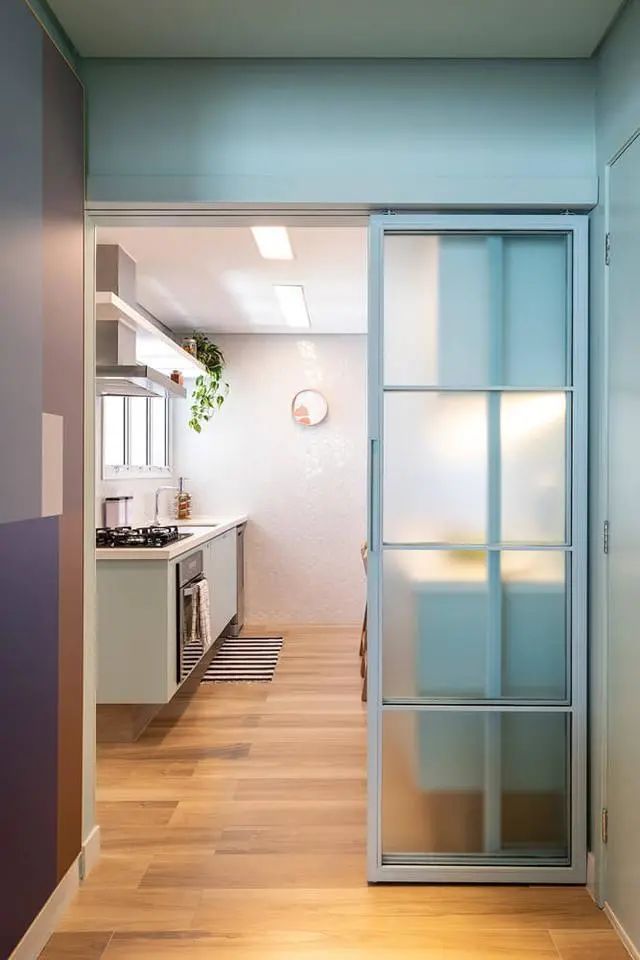 客厅和厨房之间装了同类色的吊轨玻璃移门,轻便感强,也可以具有非常好的装修隔断作用,注意下,要想在卫生上放心,最好是不要选择地轨门。