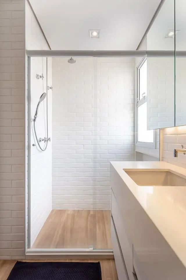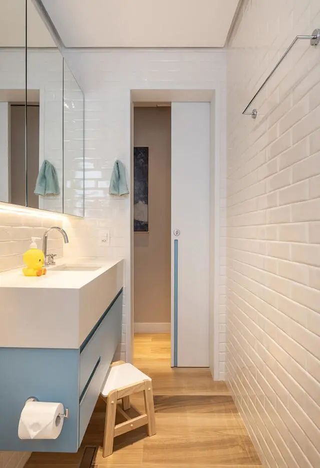 下边是他们家的2个洗手间了,维持总体室内装修风格,清爽舒适,瓷砖上墙铺满了整个洗手间,毫无例外的洗漱台都选了镜柜,能帮你收纳整理许多的物品。