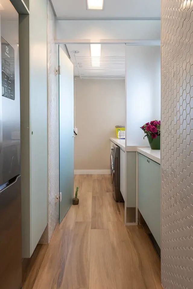 走过冰箱这一块的转角,里边便是个单独的洗衣房,平时洗衣服、晒衣服全部都是在这儿,有烘干机的话,基本上就不必担心室内的晾晒难题了。