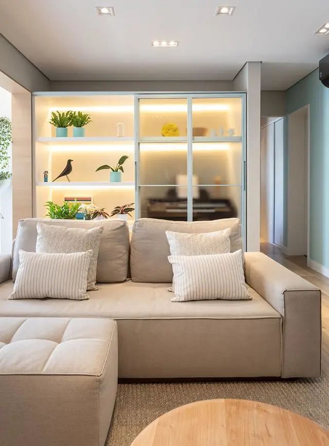 沙发不靠墙后边加了半截窄墙做装修隔断,拓宽了走廊墙,中间形成的凹陷处刚好能够 嵌入柜子,装上磨砂玻璃和柜内灯带,方便使用,不怕不够有档次!