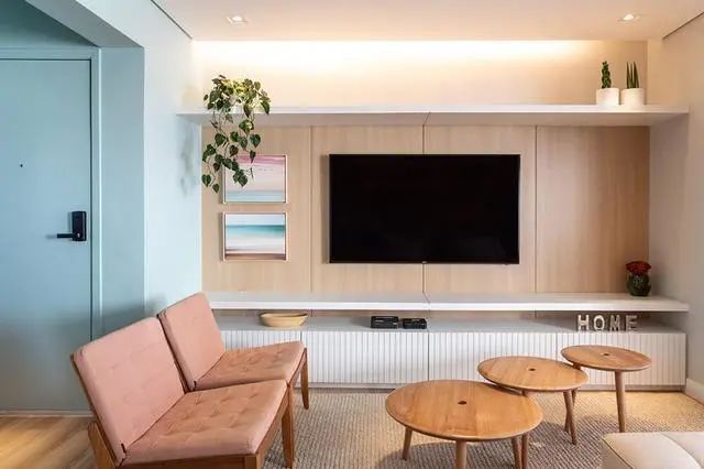别看他们家电视背景墙简单,可是也花了点小心机嘞。矮柜上下多加一层置物板,能获得翻倍的收纳整理使用面积,挨近顶部的使用率不高,能够 整齐摆放上书籍和绿植,只不过嫌弃清洁卫生不便还可以不要。