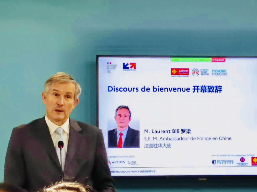 法国驻华大使罗梁先生为本次研讨会致开幕词,他说:“法国是一个经济活力四射,创新以及开放的国度,2017年开始颁布劳工政策改革计划,减税等方针政策致力于提升法国营商环境,法国在2019年位居欧洲吸引外商投资首位”。他表示欢迎中国企业到法国投资,法国政府会提供相对优惠的条件,帮助中国在当地发展壮大。