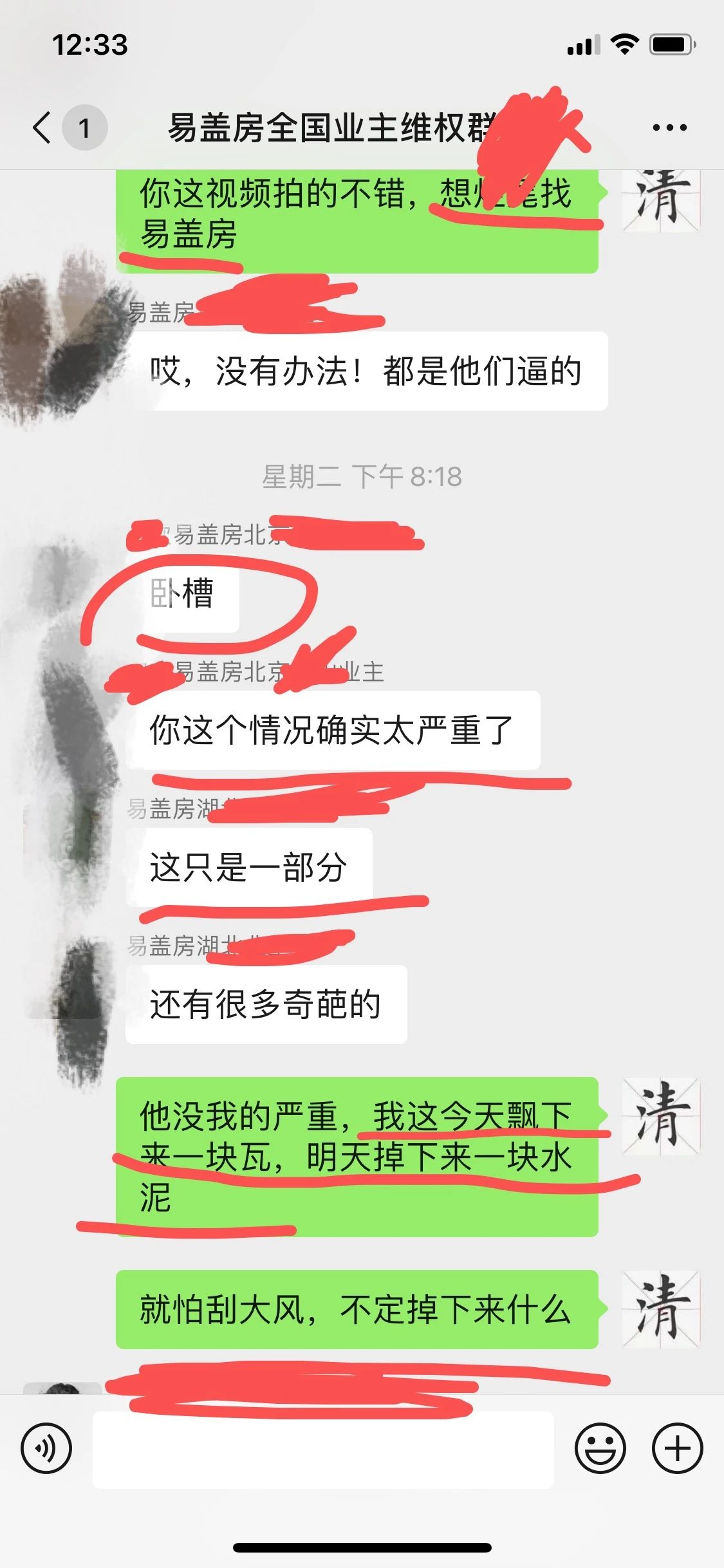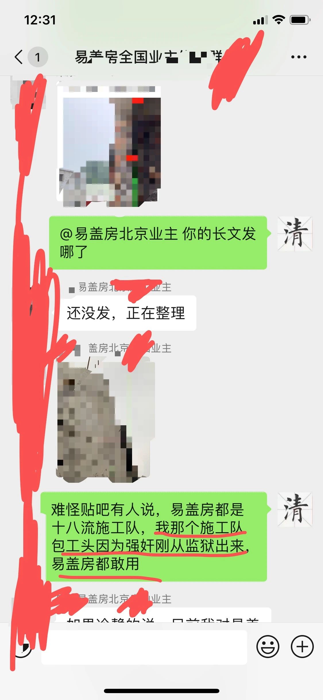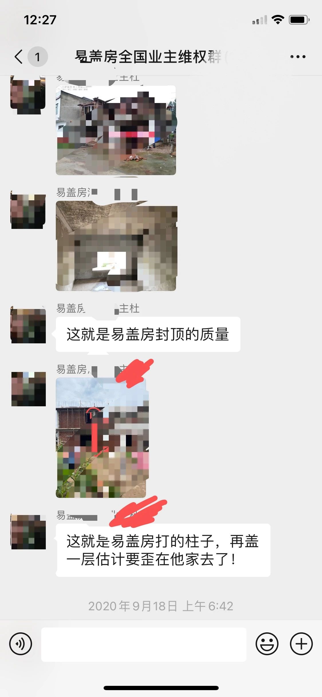 上图就是他进群打招呼和他家房子的情况,我们可以看到,房子严重的质量问题和安全隐患,和阜阳房子一样,东倒西歪,上下安全柱子都不对正。就这样情况下,易盖房不但不提供解决,还威胁这个业主,如果不继续付尾款,给你停工,并要起诉这个业主,我的天哪!