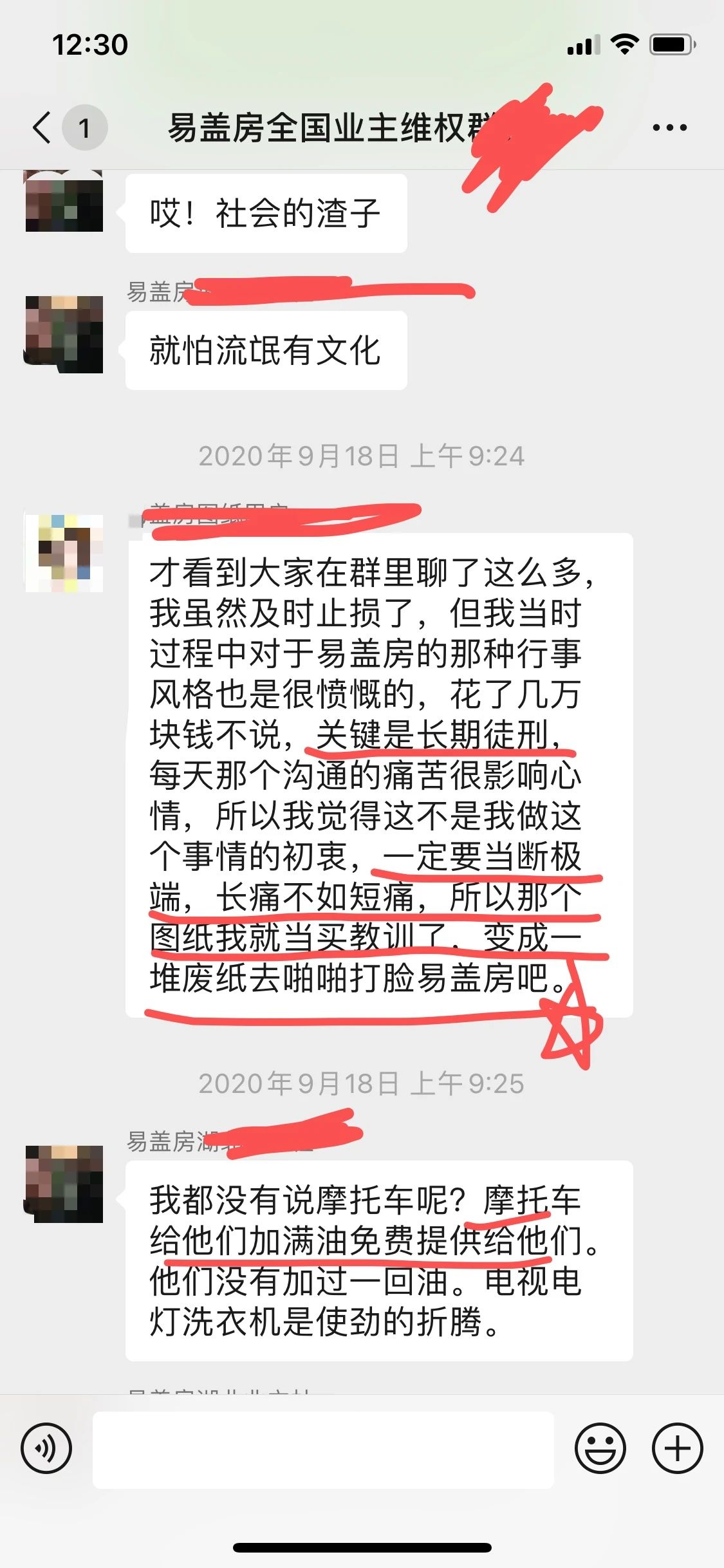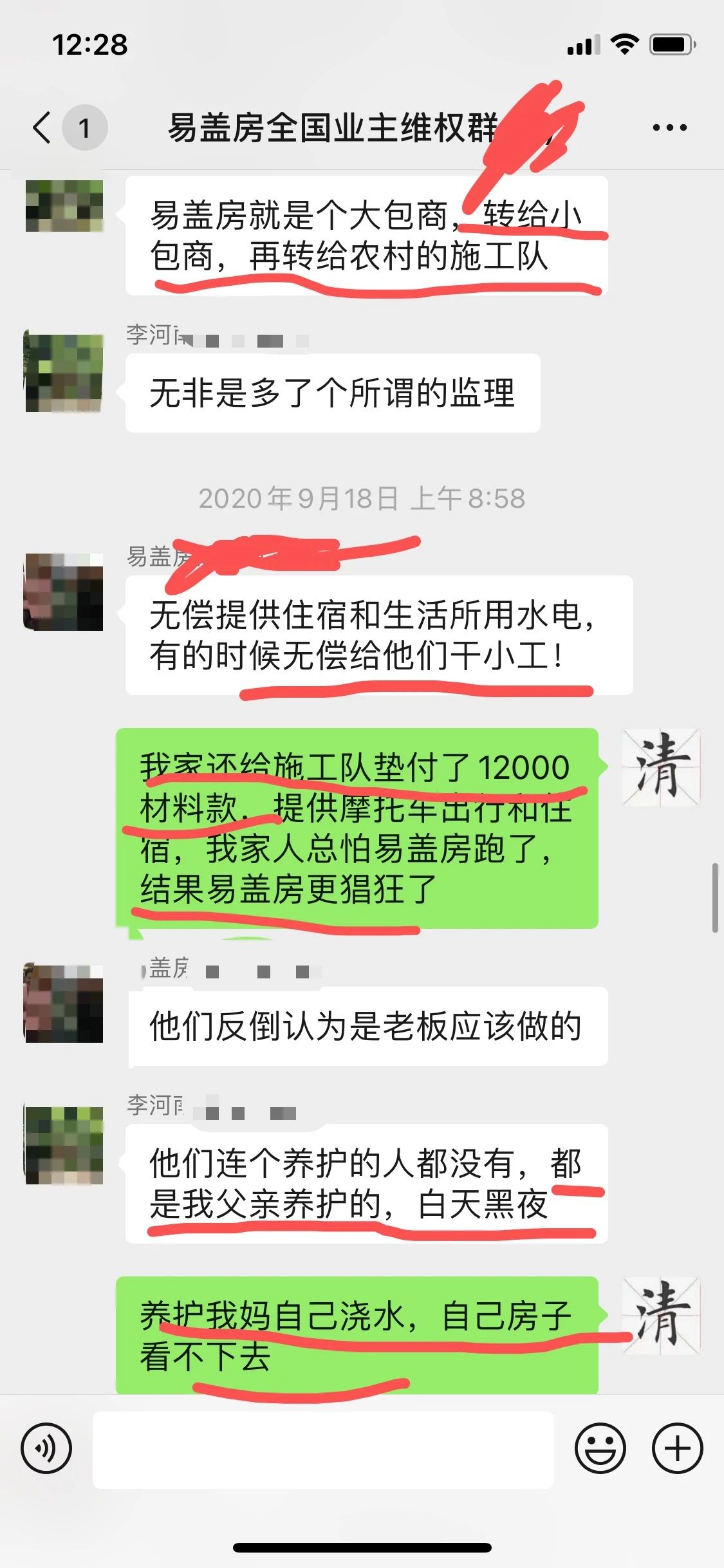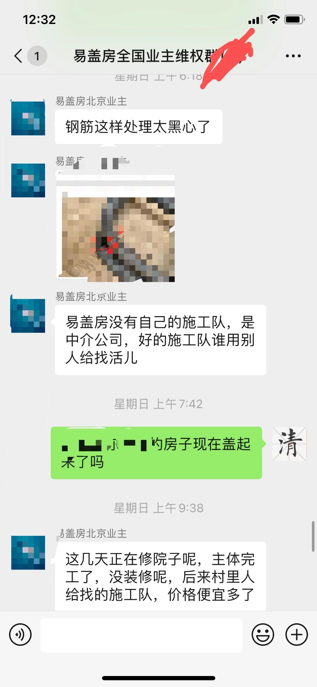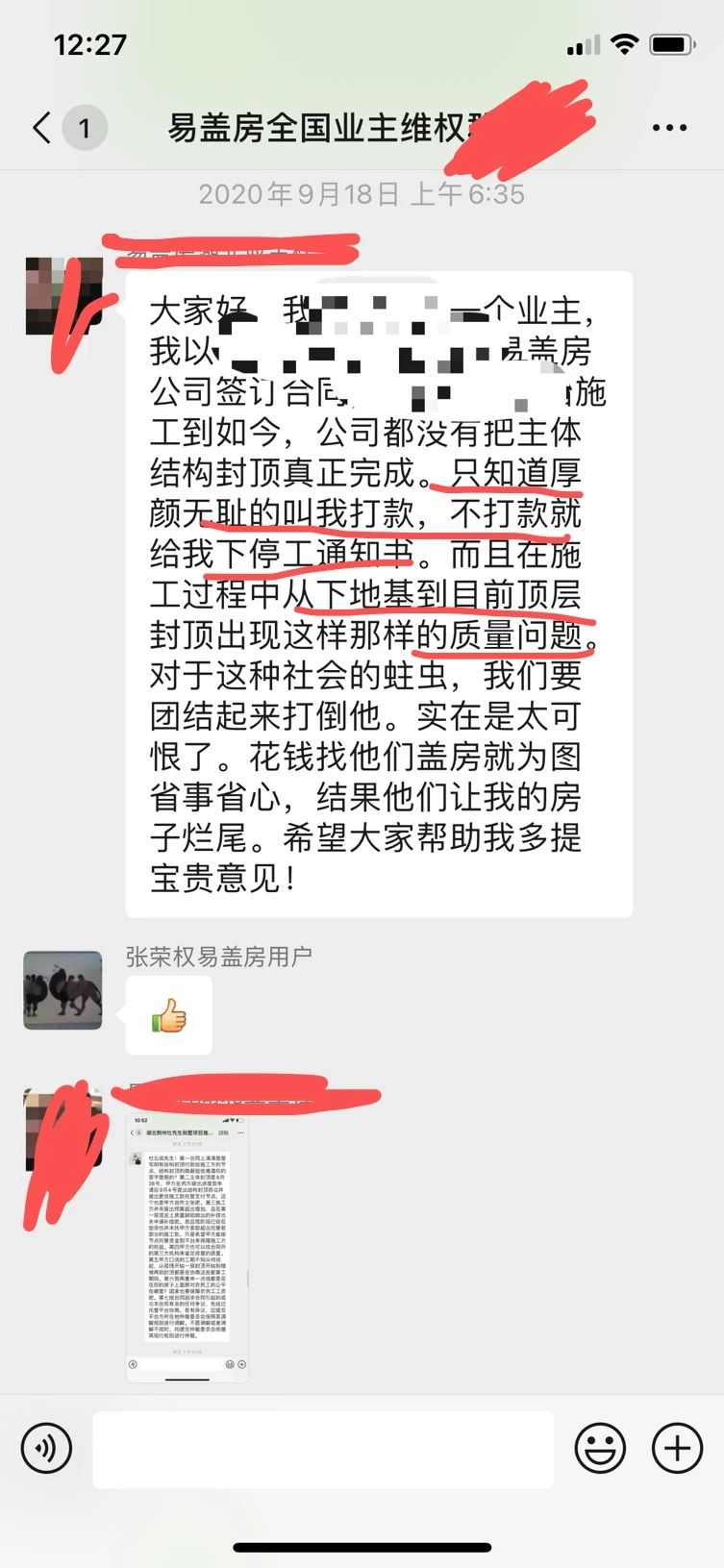 一个月前,易盖房业主维权群进来了一个军人,根据他在群里的投诉可以看到,这个军人的房子是易盖房盖的,结果全部都是豆腐渣烂尾,最可恨的是易盖房还直接给他停工,逼他结尾款。