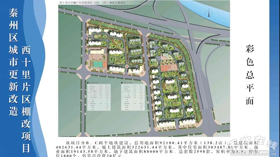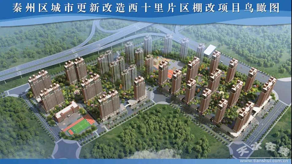 西十里片区棚户区改造项目东至G30高速天水西出口,南至秦州大道,西至山水新城·怡和园小区规划道路,北至G30高速南规划道路,总占地约138.2亩,概算总投资20亿元。项目分两期建设,总建筑面积40.3万平方米,项目设计总户数2598套。项目规划配建一所小学、一所幼儿园,设计地下停车位1800个,最大限度满足群众的生活需求。