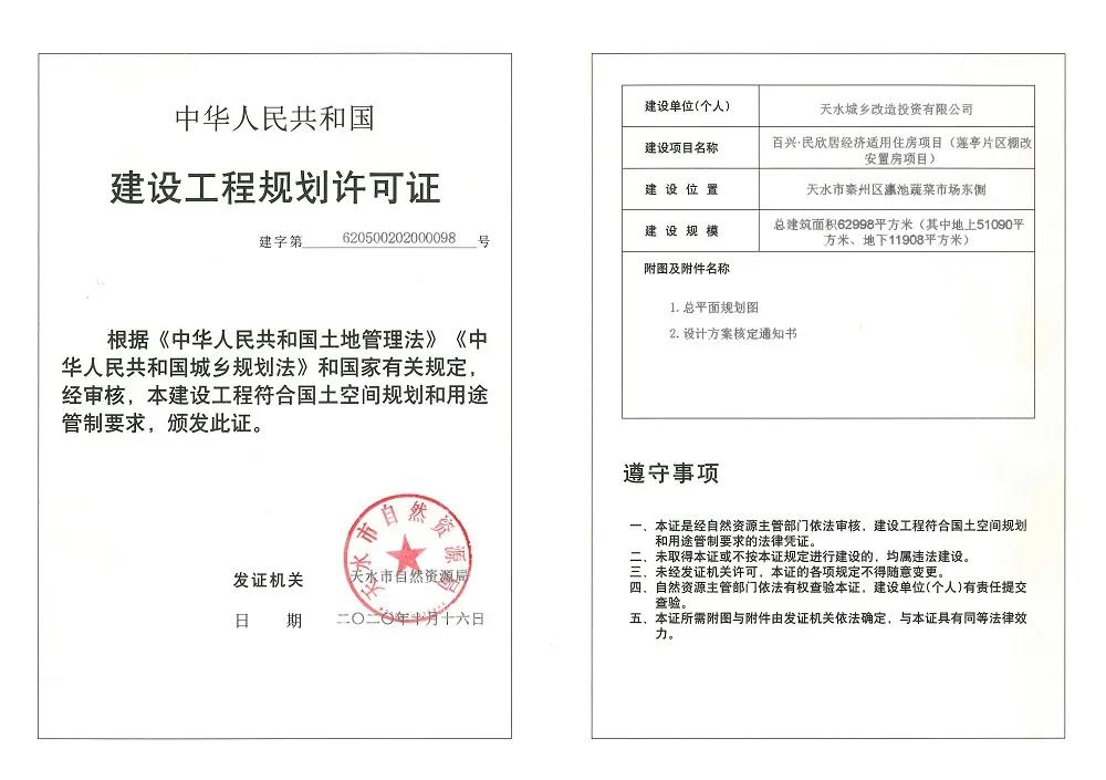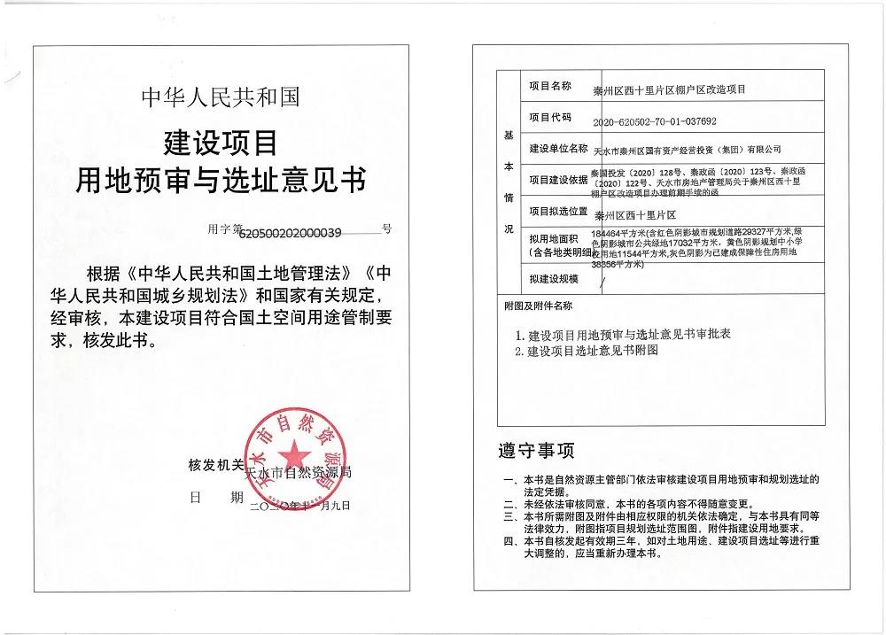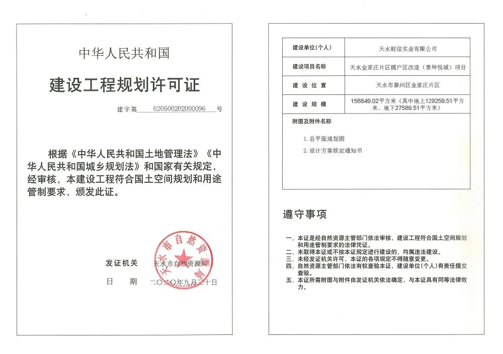 11月10日,天水市自然资源局发布莲亭、金家庄、西十里三大棚改的最新动态,其中天水金家庄片区棚户区改造(景坤悦城)项目与百兴·民欣居经济适用住房项目(莲亭片区棚户区安置房项目)两大棚改项目成功取得建设工程规划许可证,建设工程即将启动;而秦州区西十里片区棚户区改造项目由于启动较晚,目前正式获得建设项目用地预审与选址意见书。