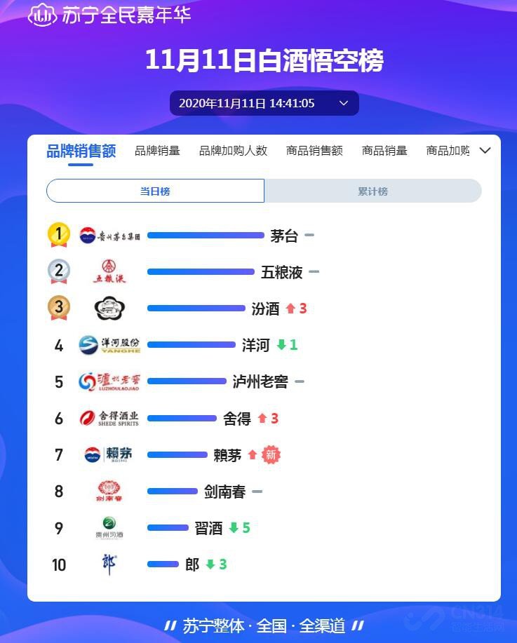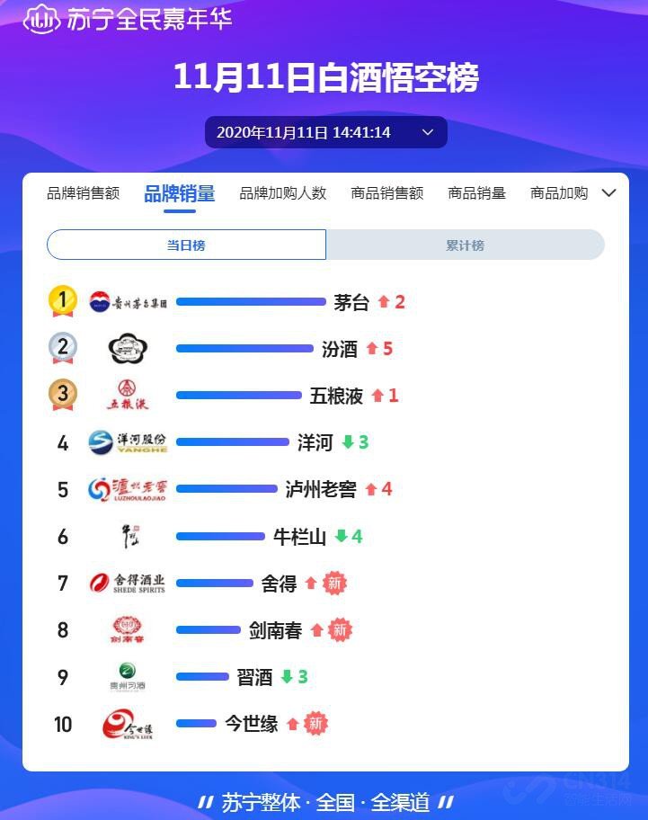 从今天的榜单情况来看,茅台真是笑到了最后!品牌销售额方面,茅台稳获第一,五粮液位列第二,前两名的位置在这11天时间里基本上就没怎么变过;而汾酒则算是逆袭成功,拿到了第三名,把洋河、泸州老窖、舍得、剑南春、郎酒都甩在了身后。