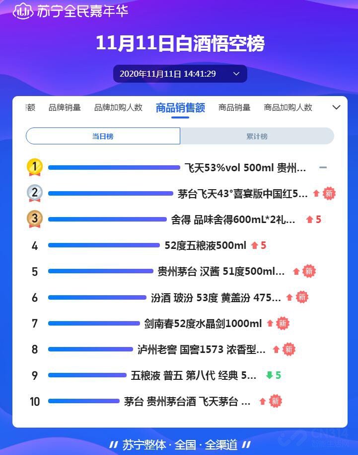 而单品销售额方面就能看出谁家品牌最受到酒鬼们的待见了,毫无疑问是53度飞天茅台豪揽头名,独特的酱香口味真的是让人入口不忘、下肚舒坦,最关键是活动期间只要1499元价格,这应该是平时根本拿不到的价;而第二名也是茅台品牌的当红酒款,43度中国红不仅大吉大利,而且价格相对实惠很多。
