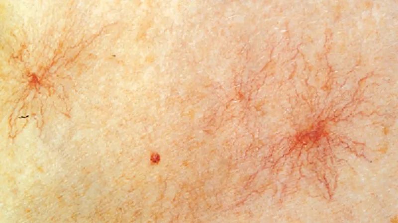 蜘蛛痣与体内雌激素含量的增加有关,健康人也可能出现。肝病患者由于肝脏对雌激素灭活作用降低,引发蜘蛛痣。丨huidziekten.nl