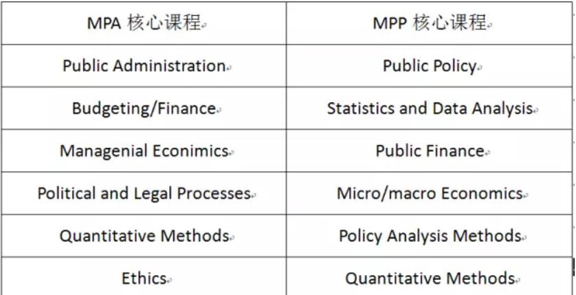一般MPP比MPA 更加偏理科,会有更多的数据分析的因素在,比如回归分析,有些码code,量化分析程度比较深,但是基本上学校要求的core class 大同小异。课程方面都要求学生学微观/宏观经济学、政策分析、数量分析等经济政策量化型的课程。