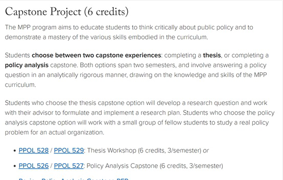 一般MPP/MPA会有一个叫capstone 的毕业项目(下图是Georgetown McCourt School of Public Policy 的capstone 项目)或者类似的项目要求学生面对真实的客户解决现实世界关于经济和政策的问题。