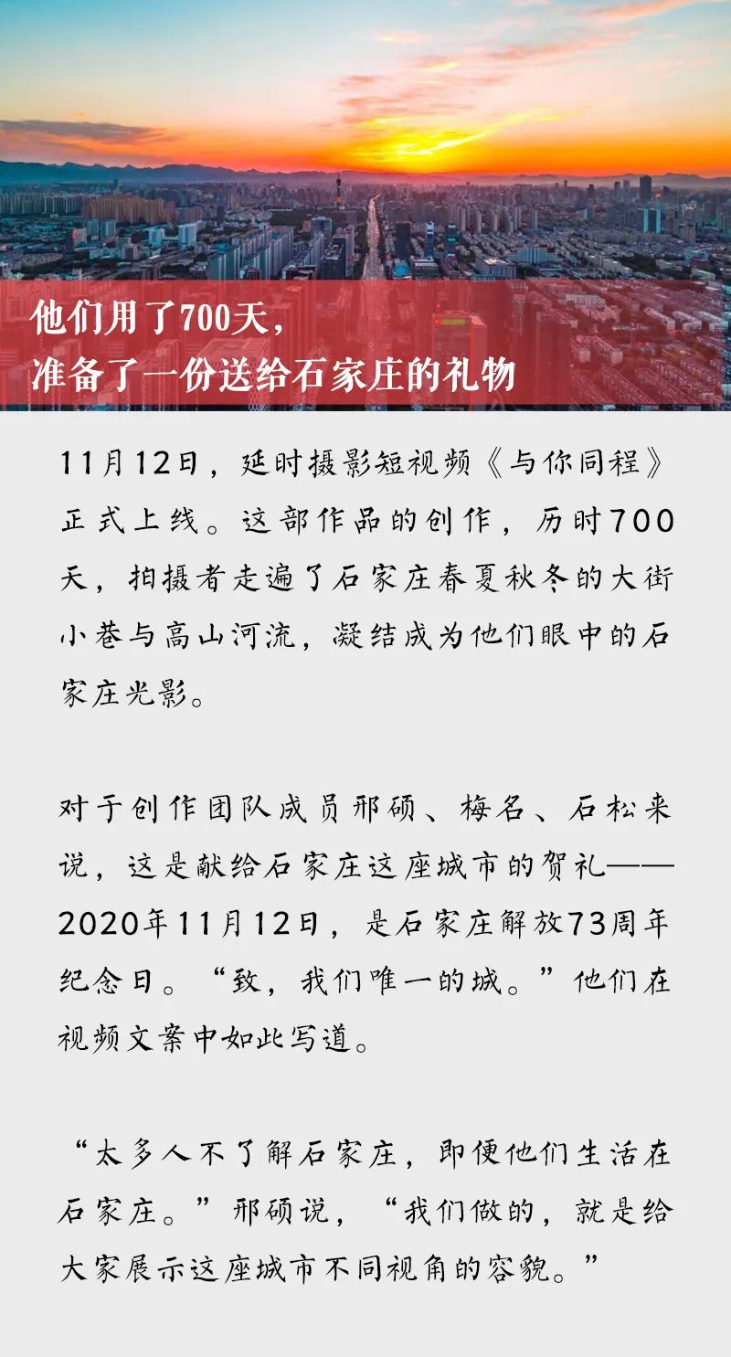 石家庄解放纪念日这一天,延时摄影作品《与你同程》正式上线,点击量和评论数都创下公众号的记录。
