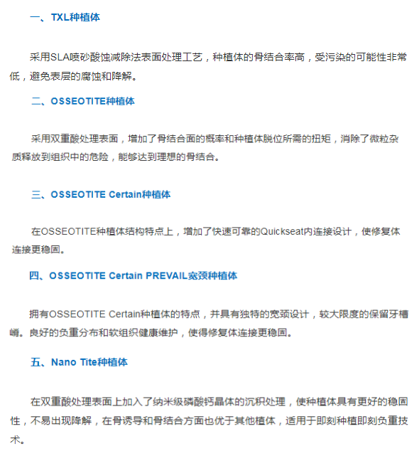 3i种植牙:具有独特的OSSEOTITE表面处理技术,可以确保种植牙的咀嚼力量;摆脱了其他种植牙翻瓣、缝合拆线等步骤,将创伤降低到较低程度,减少肿痛和出血量,缩短种植所需时间;型号较多,适合不同情况的种植。
