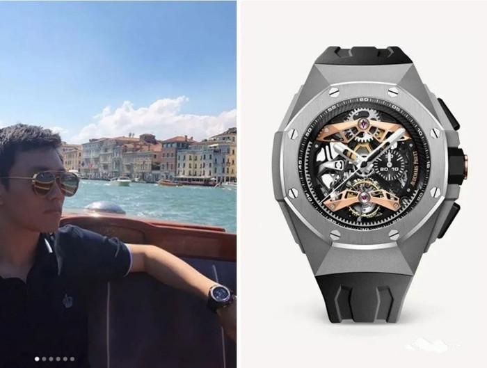 在社交平台公布出的这张独照,左手上戴了一块价值76万的皇家橡树万年历,潮流范拿捏得很到位。